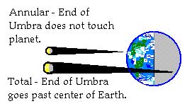 Because the size of the Moon and Sun in the sky is just about the same, there are times when you might see a Total Solar Eclipse and other times an Annular Solar Eclipse if you are in the right location - the central path of totality or annularity. If you are outside this path you might see a partial eclipse or no eclipse at all.