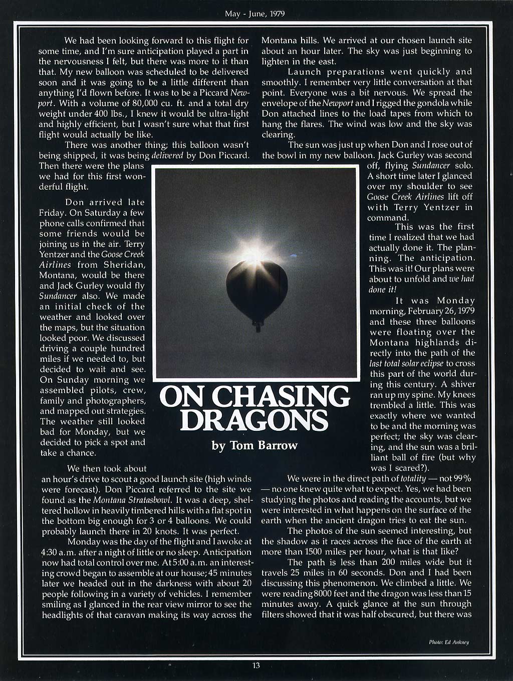1979 - NASA Learjet Observatory, KC-135 Los Alamos, NASA T-38 chase the eclipse across North America.(1) The FAA reported that over 1000 aircraft were in the air over the continental USA while the eclipse was underway. NASA astrophysicist astronauts (then candidates for the program) Sally Ride and Steve Hawley photographed TSE 1979 from a T-38 trainer at 43,000 ft.(1) Don Piccard and Tom Barrow observed from a hot air balloon in Montana in February 1979. Here are links to the Tom's article in May/June 1979 Ballooning Journal. Page 1 * Page 2 |