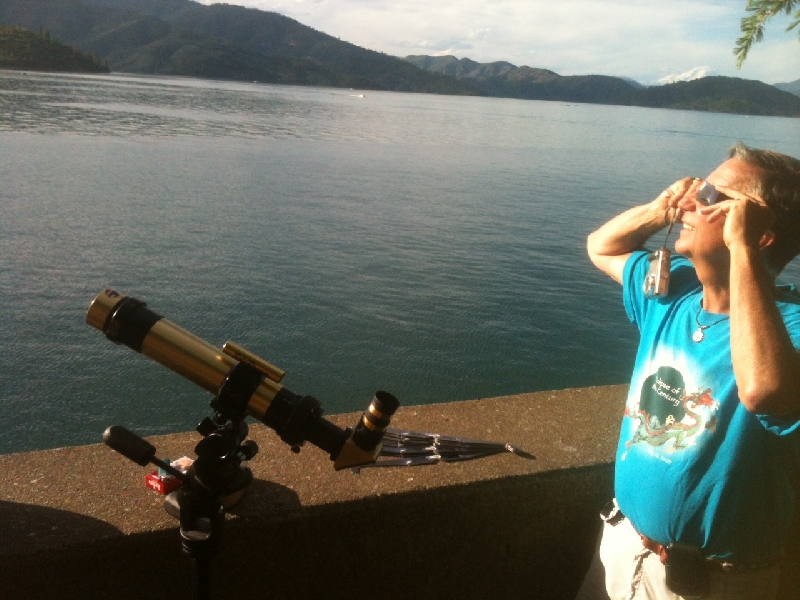 Hydrogen alpha telescope and Donald using solar glasses to watch the partial phase of the eclipse. - courtesy of Bill Kramer