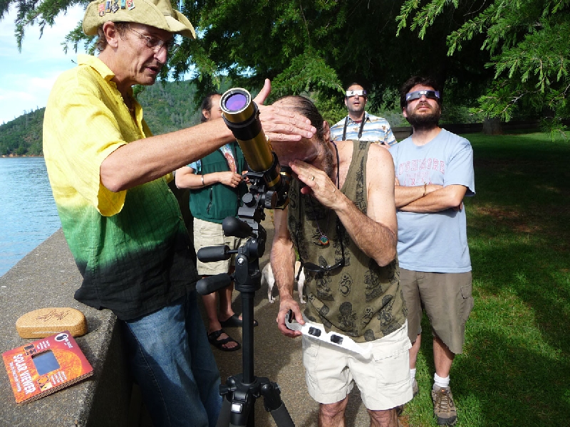 Mt Shasta Lake dam observing site with Coronado hydrogen alpha telescope and viewers. Bill Kramer (with silly hat) shares the view and talks about the view through the telescope. Photo by Dale G.