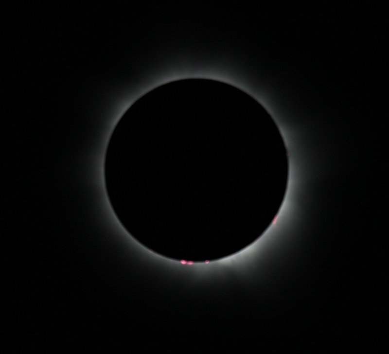C2 plus a few seconds as the prominences are still visible. Canon 400mm handheld on board the Paul Gauguin cruise ship. - courtesy of Denise Kramer